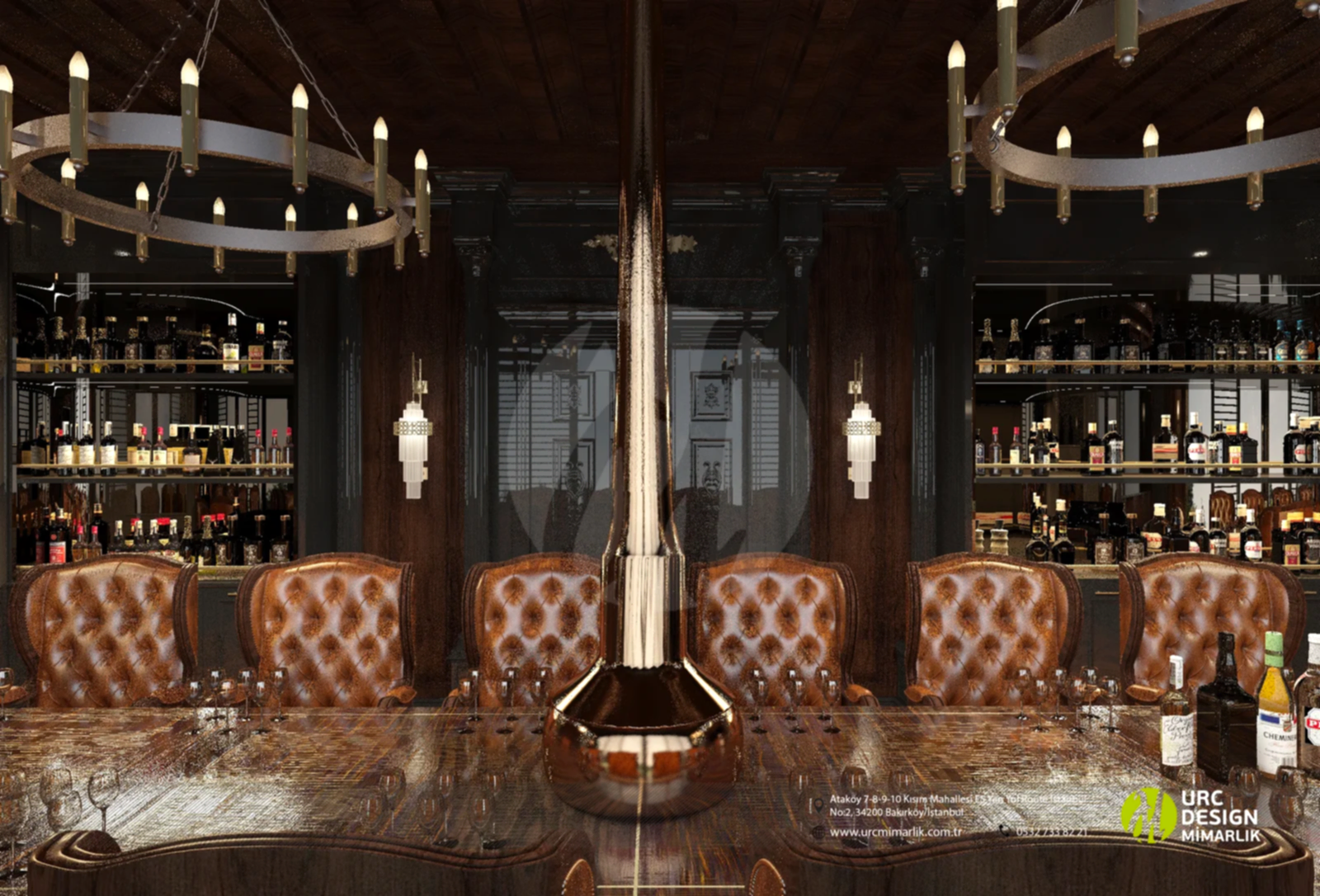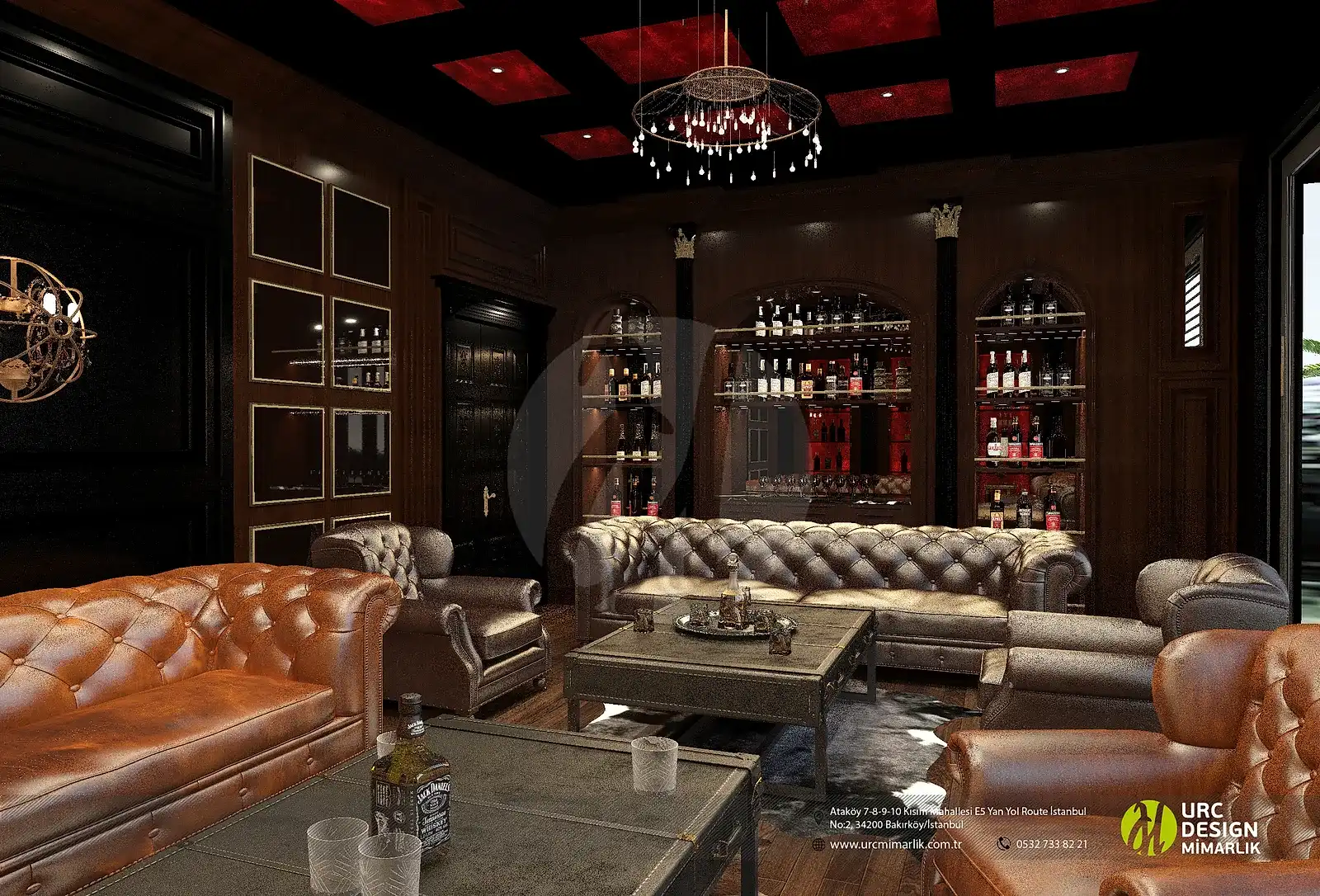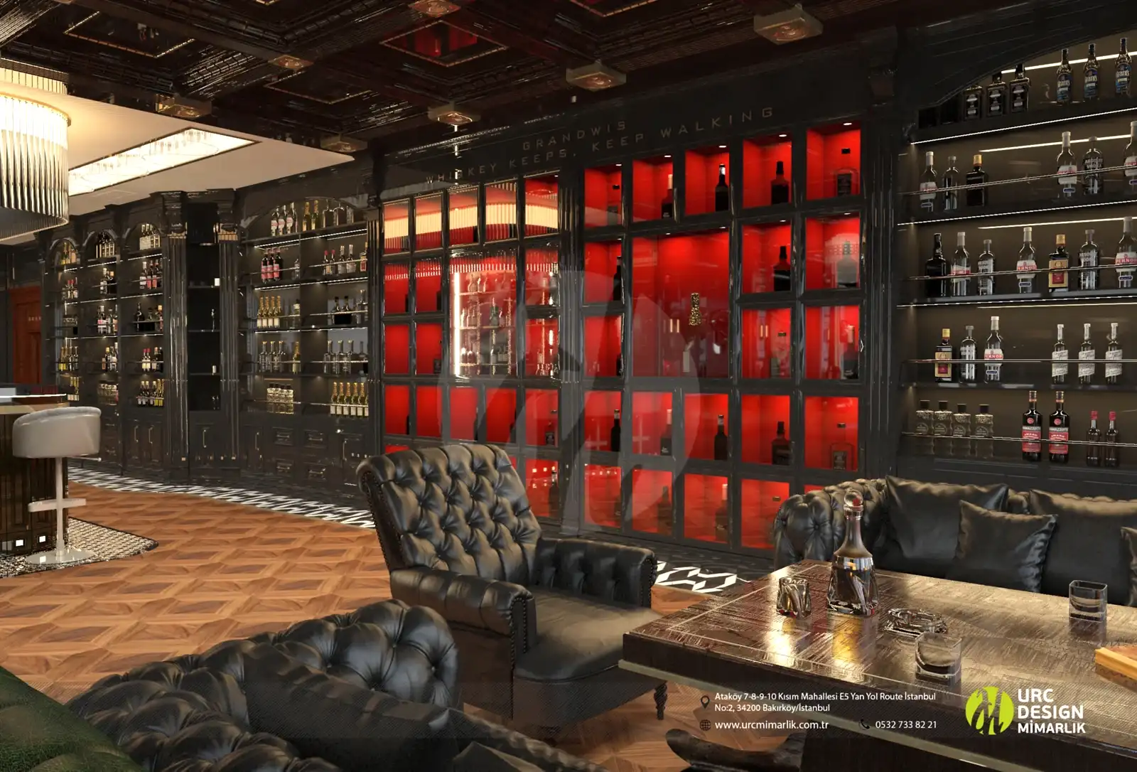 Ayrıca, iç mekan düzenlemesi, oturma gruplarının stratejik konumlandırılması ve yüksek kaliteli malzemelerin kullanımıyla konforu ön planda tutuyor. Bar alanındaki ahşap detaylar ve metal aksesuarlar, modern bir endüstriyel dokunuş eklerken, geniş ve ferah mekan düzeni, konukların rahatça dolaşmasını sağlıyor. Whiskey Lounge'un iç mekan tasarımı, konuklarına unutulmaz bir atmosferde, kaliteli zaman geçirme imkanı sunarak, keyifli anılar biriktirmelerine olanak tanıyor.