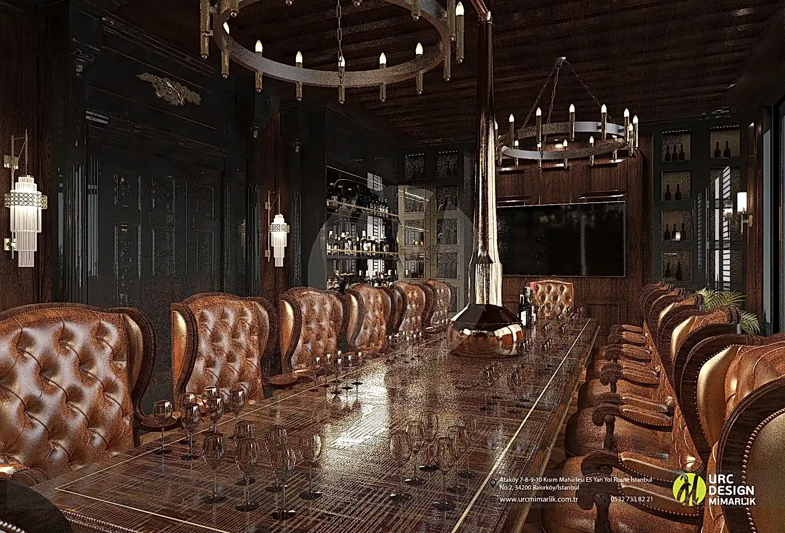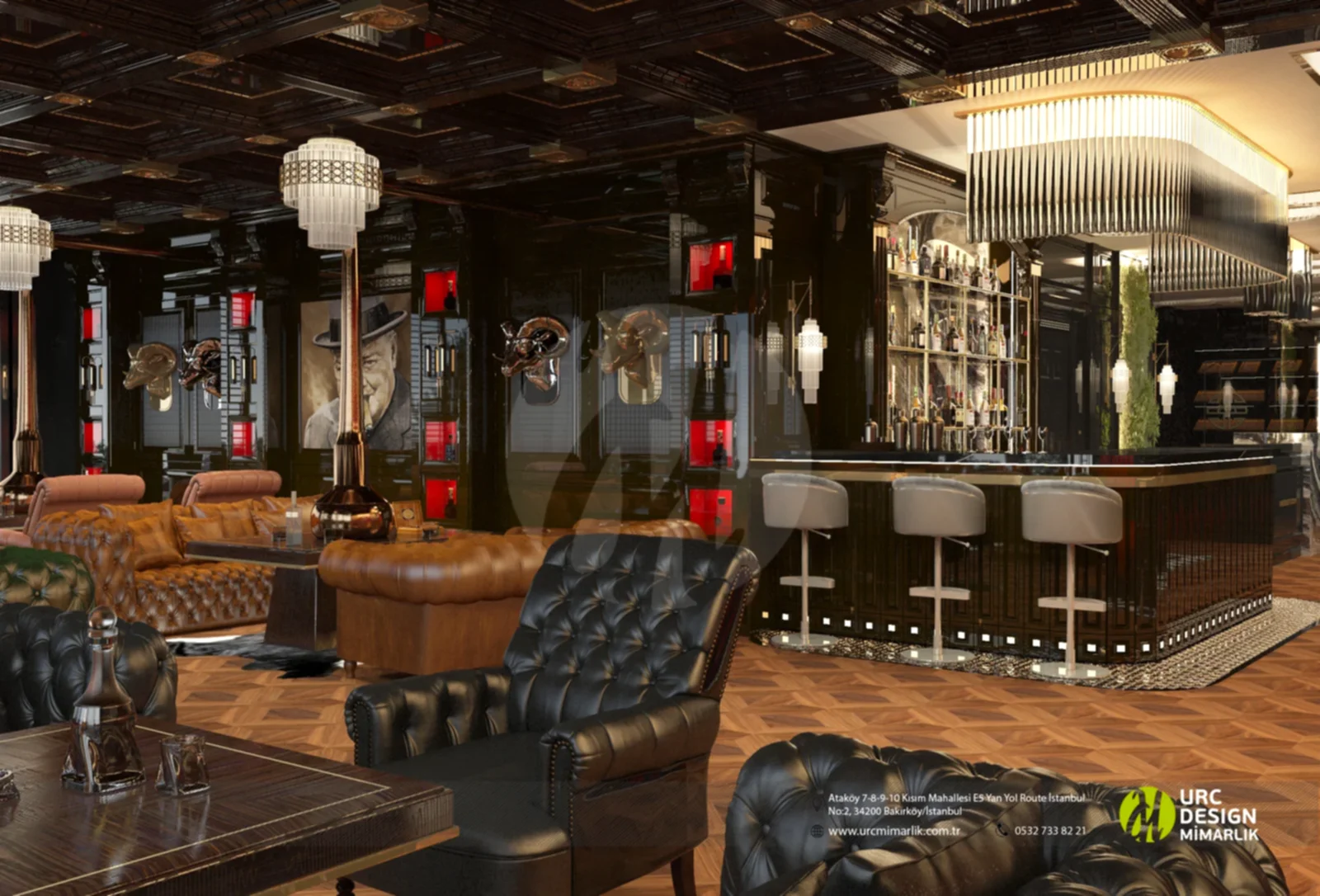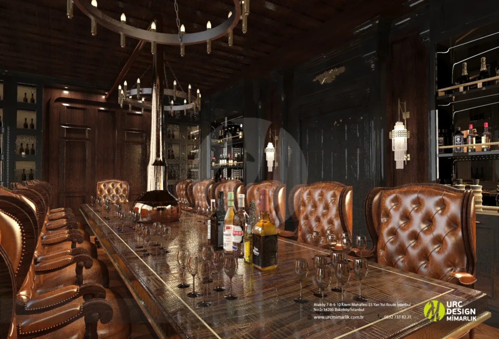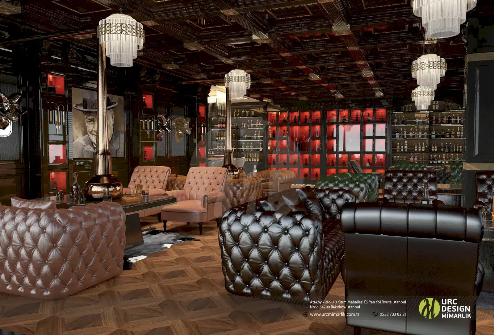 Ayrıca, iç mekan düzenlemesi, oturma gruplarının stratejik konumlandırılması ve yüksek kaliteli malzemelerin kullanımıyla konforu ön planda tutuyor. Bar alanındaki ahşap detaylar ve metal aksesuarlar, modern bir endüstriyel dokunuş eklerken, geniş ve ferah mekan düzeni, konukların rahatça dolaşmasını sağlıyor. Whiskey Lounge'un iç mekan tasarımı, konuklarına unutulmaz bir atmosferde, kaliteli zaman geçirme imkanı sunarak, keyifli anılar biriktirmelerine olanak tanıyor.