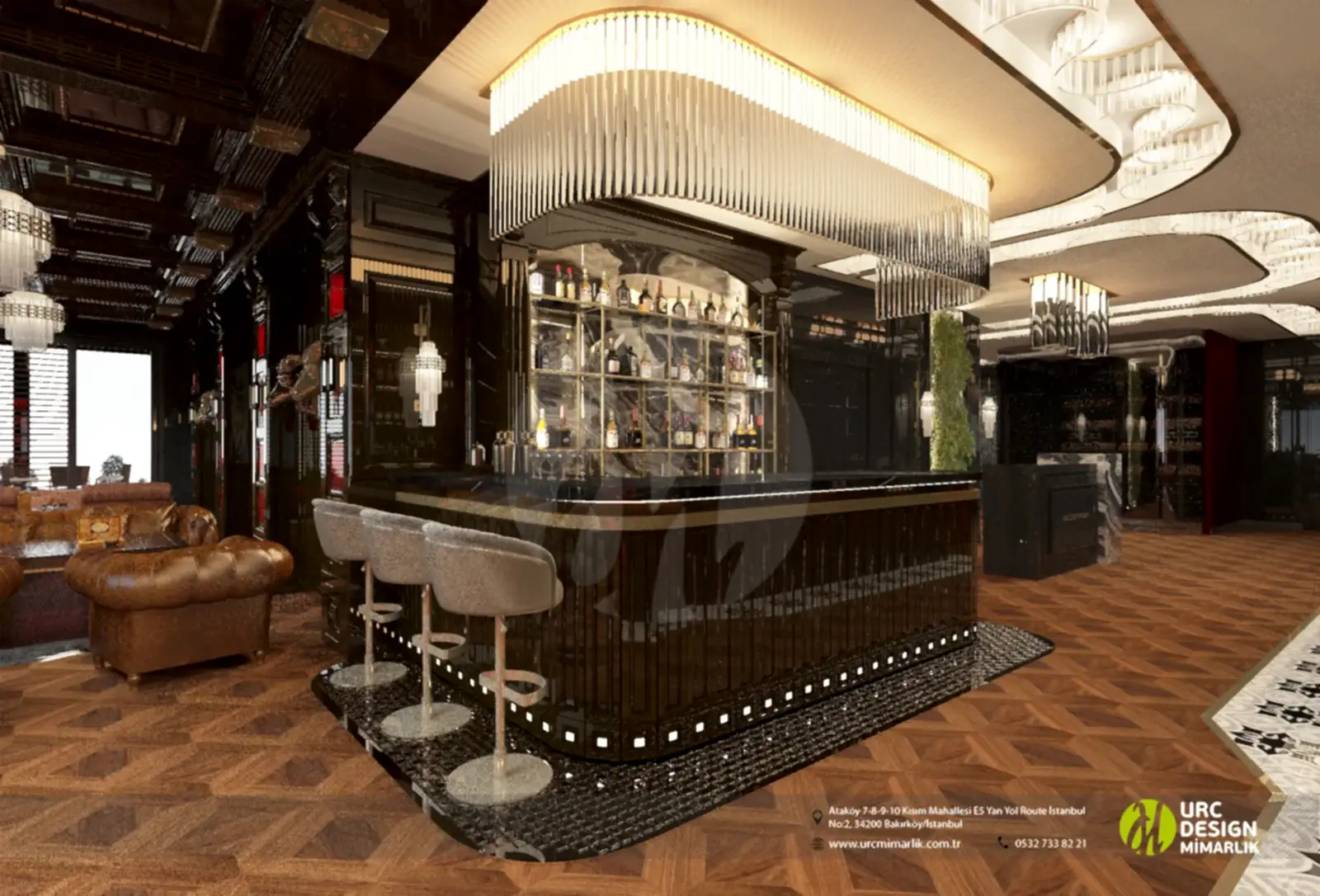 Bar tasarımı, modern ve şık çizgilerle donatılmış, konukların keyifli bir içki deneyimi yaşayabileceği özel bir alanı temsil eder.